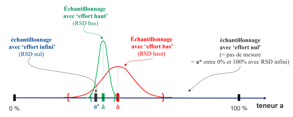 La quantification d’un lot est l’objectif de l’échantillonnage. S’agissant d’une variable aléatoire, la cible de l’échantillonnage est l’estimation de l’incertitude (alt. la distribution statistique) de l’estimateur de la teneur d’intérêt. Cette distribution dépend des caractéristiques du lot et du protocole d’échantillonnage utilisé pour mesurer la teneur d’intérêt. Là où un lot de déchets électroniques possède une vraie teneur a^* en un métal d’intérêt, la distribution de son estimateur permet de d’associer une confiance à un intervalle de teneur dans lequel la vraie teneur se situe, ce qui peut être quantifié par un écart-type relatif (RSD). Le schéma ci-dessous illustre schématiquement le lien entre la vraie teneur a^* et son estimateur a ̂ pour un échantillonnage mécaniquement correct et juste. La dispersion de la distribution de l’estimateur peut être associé à un effort d’échantillonnage, où l’effort maximal, qui correspondrait à la caractérisation de chaque particule du lot entier, aboutirait à une estimation de la vraie teneur sans aucune incertitude liée à l’échantillonnage.