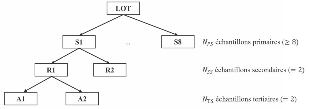 - La première solution d’échantillonnage des déchets de la mine urbaine étudiée repose sur des approches fondées sur la répétition des analyses, à l’instar de ce qui est mis en œuvre au BRGM pour les déchets de cartes électroniques. Ses principes et règles de calcul ont été développés principalement par Ramsey puis implémentés dans différents contextes. Ces travaux constituent une référence en matière de pratiques et de méthodologies visant à fournir des estimations fiables de l’incertitude d’échantillonnage, notamment dans le domaine de l’agroalimentaire et de la caractérisation des sites et sols pollués. Le manque d’application sur les déchets justifie une analyse approfondie et une adaptation des méthodes proposées en vue de leur application à l’échantillonnage des métaux de la mine urbaine dans ce cadre spécifique. L’approche est basée sur la réplication de mesures et est applicable à n’importe quel système. La structure du plan d’échantillonnage d’un lot comporte 3 étages d’échantillonnage, qui consiste en la prise de N_PS échantillons primaires, N_SS échantillons secondaires et N_TS échantillons tertiaires sur lesquels sont réalisées les analyses de teneur. Chaque échantillon contient une fraction de la masse de l0% d’échantillon de l’étage supérieur, 10% ou moins. Un tel protocole d’échantillonnage conduit à N_PS×N_SS×N_TS mesures de teneur d’un analyte d’intérêt.