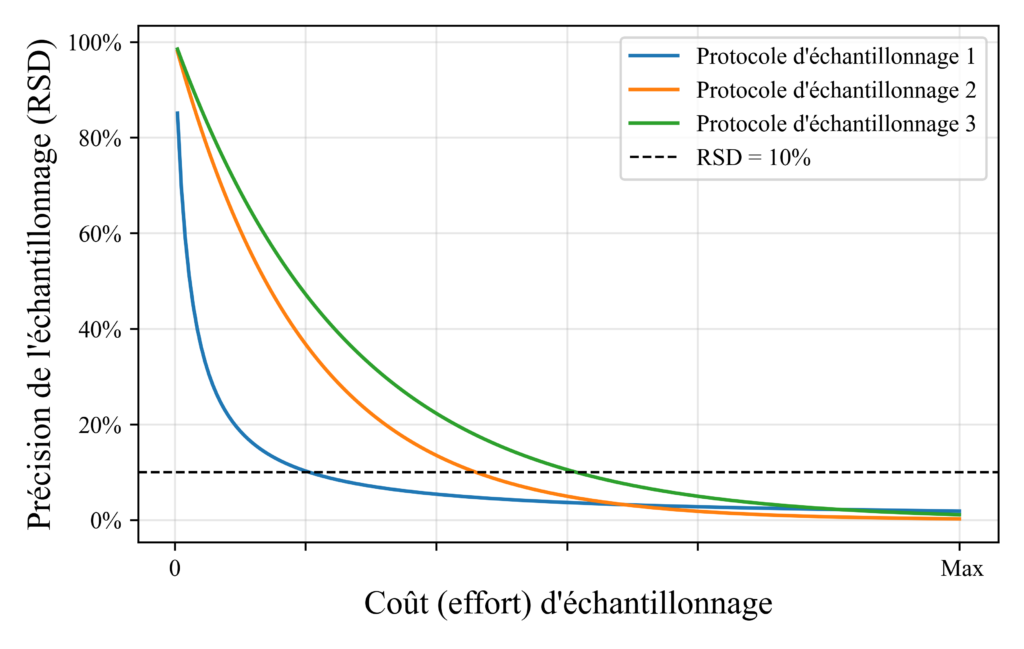 Le schéma ci-dessous est une illustration conceptuelle de la relation décroissante entre la précision de l’estimation de la teneur et le coût de l’échantillonnage. Le coût est une grandeur qui sera définie dans le travail de thèse sur la base de données terrain comme mesure de l’effort d’échantillonnage, et qui dépend principalement du nombre d’incréments utilisés pour produire un échantillon, de la masse prélevée, et des opérations mécaniques de préparation et d’analyses. Le postulat de ce travail de thèse est que parmi plusieurs solutions d’échantillonnage, il en existe une qui permettra d’atteindre un seuil de précision spécifié pour un coût d’échantillonnage minimum. L’ambition de la thèse est de développer un formalisme qui se prête à la recherche d’une solution optimale, celle qui garantit l’échantillonnage le plus adapté à l’objectif visé.