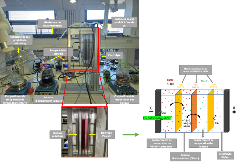 L’intégration de nouvelles technologies dans les procédés de recyclage des batteries lithium-ion apparaît donc indispensable. L’électrodialyse, une technique de séparation utilisant un champ électrique et des membranes pour trier les ions, offre une alternative prometteuse. Cette étude propose une approche innovante combinant la lixiviation à l’acide citrique, un acide faible et biodégradable, et l’électrodialyse, afin d’extraire sélectivement le lithium tout en valorisant le nickel, le manganèse et le cobalt contenus dans les matériaux de cathodes de type NMC (nickel-manganèse-cobalt).